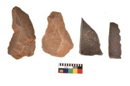 | Description / विवरण | There are n 4 utilized flake cores. There are multidirectional irregular scar pattern on both dorsal and ventral face of the flake cores. One is tapering at one end and three have sharp edges. |