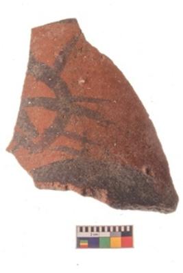 | Description / विवरण | Specimen of potsherd black on red painted pottery. It is fine fabric in sharp contrast with painted design are executed in black pigment. |