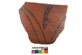 | Description / विवरण | Specimen of Potsherd black on red painted pottery. It is fine fabric in sharp contrast with painted design are executed in black pigment. |