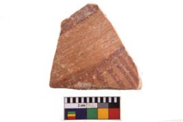 | Description / विवरण | Specimen of potsherd with decorative geometric painting. Type Black on Red Ware . |