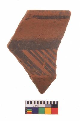 | Description / विवरण | Specimen of potsherd with black decorative geometric Linear painting, Type Black on Red Ware . |