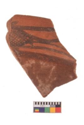 | Description / विवरण | Specimen of potsherd black on red painted pottery. It is fine fabric in sharp contrast with painted design are executed in black pigment. |