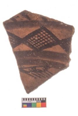 | Description / विवरण | Specimen of potsherd with black decorative geometric diamond set broad horizontal bands painting. |