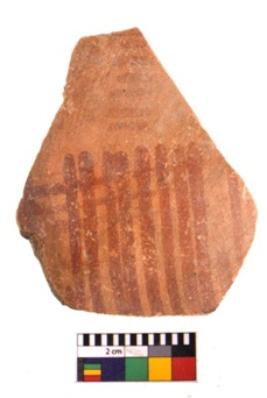 | Description / विवरण | Specimen of potsherd with decorative geometric painting. Type Black on Red Ware . |