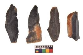 | Description / विवरण | There are n 4 utilized flake cores. There are multidirectional irregular scar pattern on both dorsal and ventral face of the flake cores. Two are tapering at one end and two have sharp edges. |