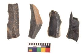 | Description / विवरण | There are n 4 utilized flake cores. There are multidirectional irregular scar pattern on both dorsal and ventral face of the flake cores. Two are tapering at one end and two have sharp edges. |