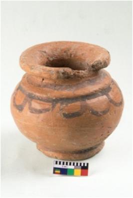 | Description / विवरण | A full pot with a fragment missing from the rim. Also two bands are executed in black pigment while the lower has hanging line decoration. |