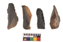 | Description / विवरण | There are n 4 utilized flake cores. There are multidirectional irregular scar pattern on both dorsal and ventral face of the flake cores. One is tapering at one end and three have sharp edges. |