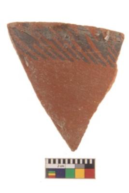 | Description / विवरण | Specimen having smooth and glossy reddish surface with geometric slanting lines painting. Type Black on Red ware |