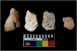 | Description / विवरण | There are n 4 of utilized worked cores. They show multidirectional irregular scar pattern. Two are tapering on one end and one has a broken tip. |