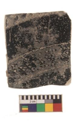 | Description / विवरण | Specimen of square shaped having smooth and glossy black surface with embossing triangles design over it. |