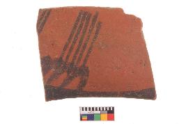 | Description / विवरण | Specimen of Potsherd black on red painted pottery. It is fine fabric in sharp contrast with painted design are executed in black pigment. |