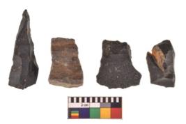 | Description / विवरण | There are n 4 utilized flake cores. There are multidirectional irregular scar pattern on both dorsal and ventral face of the flake cores. Three are tapering at one end and one has sharp edges. |