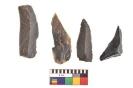 | Description / विवरण | There are n 4 utilized flake cores. There are multidirectional irregular scar pattern on both dorsal and ventral face of the flake cores. One is tapering at one end and three have sharp edges. |