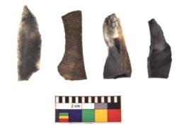 | Description / विवरण | There are n 4 utilized flake cores. There are multidirectional irregular scar pattern on both dorsal and ventral face of the flake cores. One is tapering at one end and three have sharp edges. |