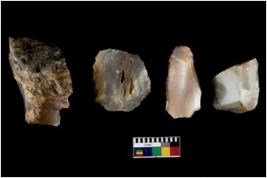 | Description / विवरण | There are n 4 cores; one of chert and three of chalceony. The ridges on the core runs parallel to the edge. One has a flat base. |