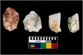 | Description / विवरण | There are n 4 of utilized worked cores. They show multidirectional irregular scar pattern and have sharpe edges. Two are tapering on one end and two have broken tip. |