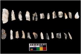 | Description / विवरण | There are n 20 blades; most of which are tapering at one end and are pointed. The blades are blunt along the surface and show single percussion. The edges are smooth and sharp. The debitages appear to be points or stone chips. |