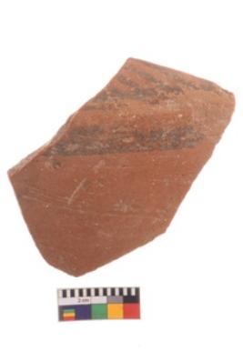 | Description / विवरण | Specimen of potsherd with traces of decorative geometric painting, Type Black on Red ware . |