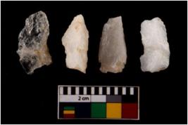| Description / विवरण | There are n 4 flake cores. All of them are fully fluted flake cores without any trace of crested ridge flakes. Some are tapering at one end and some have sharp edges. |