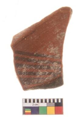 | Description / विवरण | Specimen of potsherd with traces of decorative geometric painting, Type Black on Red ware . |