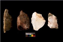 | Description / विवरण | There are n 4 of utilized worked cores. They have sharp edges and some are tapering at one end. They show dominant irregular scar pattern. Two of chelcedony and two of quartz. |