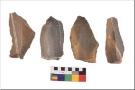 | Description / विवरण | There are n 4 utilized flake cores. There are multidirectional irregular scar pattern on both dorsal and ventral face of the flake cores. Three are tapering at one end and one has sharp edges. |