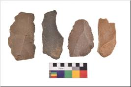 | Description / विवरण | There are n 4 utilized flake cores. There are multidirectional irregular scar pattern on both dorsal and ventral face of the flake cores. Three are tapering at one end and one has sharp edges. |