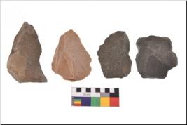 | Description / विवरण | There are n 4 utilized flake cores. There are multidirectional irregular scar pattern on both dorsal and ventral face of the flake cores. Three have flat base and one is tapering at one end. |