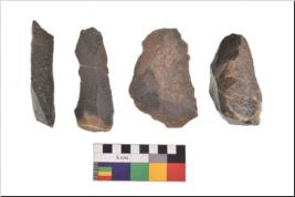 | Description / विवरण | There are n 4 utilized flake cores. There are multidirectional irregular scar pattern on both dorsal and ventral face of the flake cores. Two are tapering at one end and two have sharp edges. |