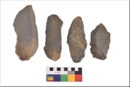 | Description / विवरण | There are n 4 utilized flake cores. There are multidirectional irregular scar pattern on both dorsal and ventral face of the flake cores. Two are tapering at one end and two have sharp edges. |