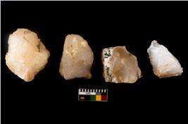 | Description / विवरण | There are n 4 of utilized worked cores. Some have flat base and are tapering at one end. They have sharp edges. Three of chalcedony and one of quartz. |