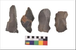 | Description / विवरण | There are n 4 utilized flake cores. There are multidirectional irregular scar pattern on both dorsal and ventral face of the flake cores. Two are tapering at one end and two have sharp edges. |