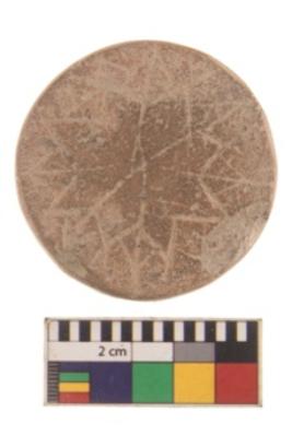 | Description / विवरण | Specimen having smooth outer edge and glossy surface with floral design of nine petals. It is reddish in colour. |