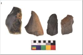 | Description / विवरण | There are n 4 utilized flake cores. There are multidirectional irregular scar pattern on both dorsal and ventral face of the flake cores. Three are tapering at one end and one has sharp edges. |