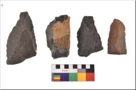 | Description / विवरण | There are n 4 utilized flake cores. There are multidirectional irregular scar pattern on both dorsal and ventral face of the flake cores. Three are tapering at one end and one has sharp edges. |