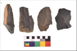 | Description / विवरण | There are n 4 utilized flake cores. There are multidirectional irregular scar pattern on both dorsal and ventral face of the flake cores. Three are tapering at one end and one has sharp edges. |