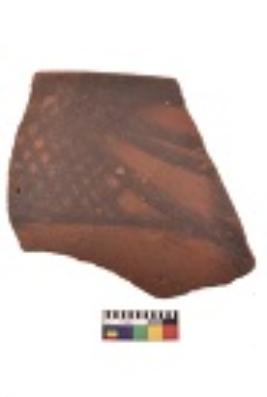 | Description / विवरण | Specimen of black on red ware with decorative geometric Three curved lines and net motif painting. |