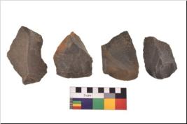 | Description / विवरण | There are n 4 utilized flake cores. There are multidirectional irregular scar pattern on both dorsal and ventral face of the flake cores. Three have flat base and one is tapering at one end. |