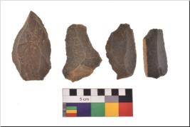 | Description / विवरण | There are n 4 utilized flake cores. There are multidirectional irregular scar pattern on both dorsal and ventral face of the flake cores. Three are tapering at one end and one has sharp edges. |