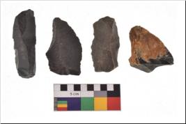 | Description / विवरण | There are n 4 utilized flake cores. There are multidirectional irregular scar pattern on both dorsal and ventral face of the flake cores. Three are tapering at one end and one has sharp edges. |