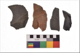 | Description / विवरण | There are n 4 utilized flake cores. There are multidirectional irregular scar pattern on both dorsal and ventral face of the flake cores. One is tapering at one end and three have sharp edges. |