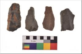 | Description / विवरण | There are n 4 utilized flake cores. There are multidirectional irregular scar pattern on both dorsal and ventral face of the flake cores. Three are tapering at one end and one has sharp edges. |