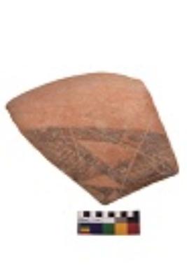 | Description / विवरण | Specimen of black on red ware with decorative geometric A row of latticed dimonds set in horizontal bands but having groups of oblique lines at interval. painting. |