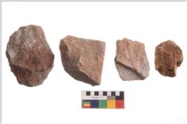 | Description / विवरण | There are n 4 utilized flakes; there are multi- directional irregular scar pattern on both dorsal and ventral face of the flakes. |