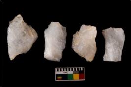 | Description / विवरण | There are n 4 flake cores. All of them are fully fluted flake cores without any trace of crested ridge flakes. Some are tapering at one end and some have sharp edges. |