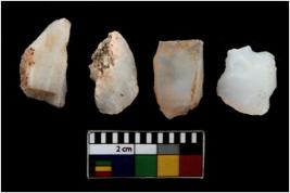 | Description / विवरण | There are n 4 of utilized worked cores; of which one is of quartz and three are of chalcedony. They show multidirectional irregular scar pattern. Two is tapering at one end. |