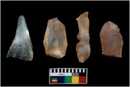 | Description / विवरण | There are n 4 of utilized worked cores; one is of chalcedony and three of chert. They show multidirectional irregular scar pattern. All are tapering at one end and are elongated in shape. All are having sharp edges. |