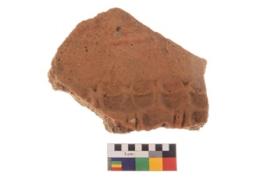 | Description / विवरण | Specimen of potsherd of red ware with decorative design. Outer surface having an applique band with a design produced by pressing two finger tips close to each other. |