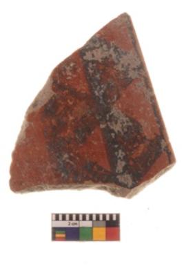 | Description / विवरण | Specimen of black on red ware with decorative geometric Double latticed loops set in two horizontal bands painting. |